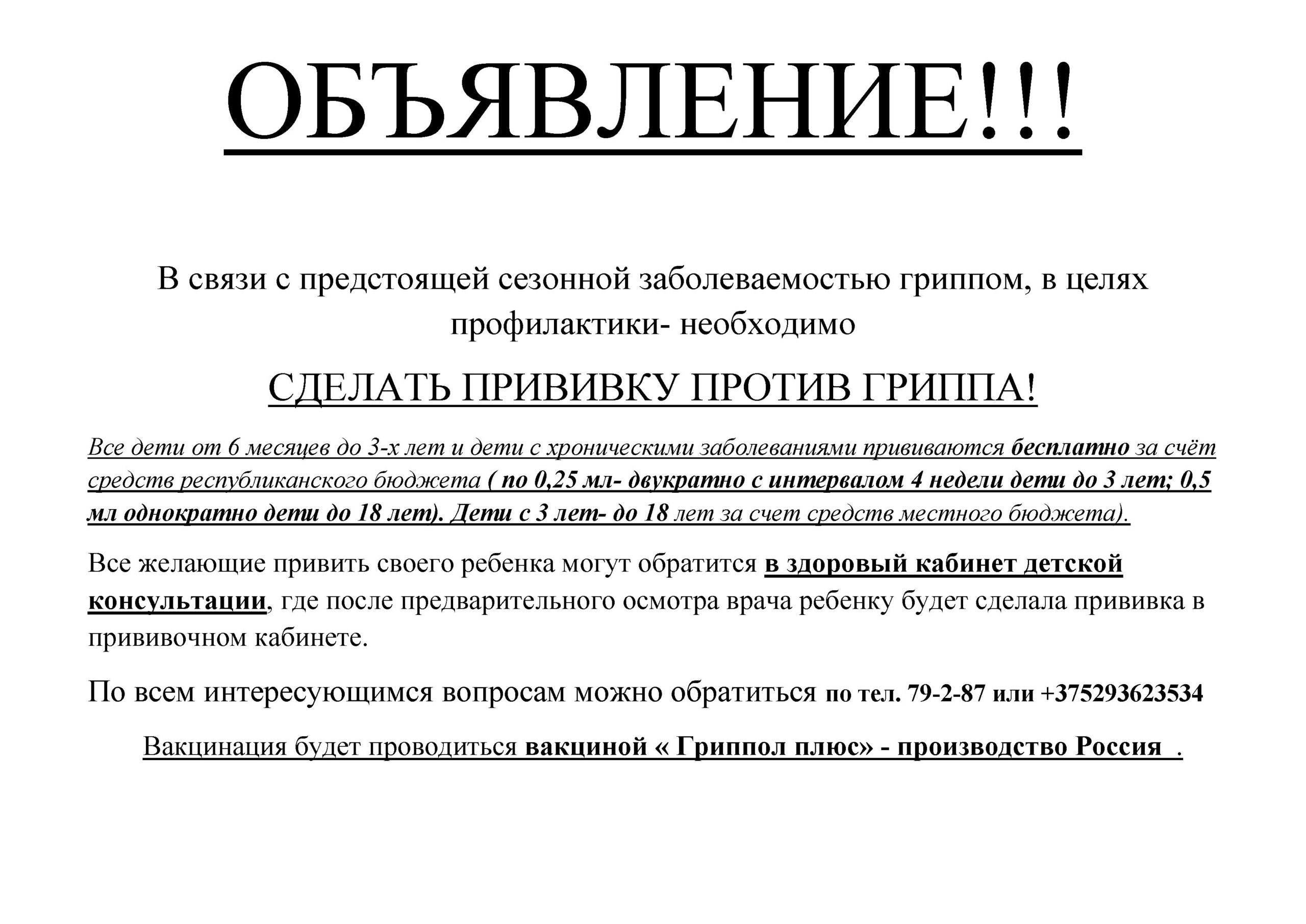 Обьявление Диспансеризация детского населения в возрасте до 17 лет включительно проводится на базе детской консультации УЗ «Краснопольская ЦРБ». Врач педиатр ведет прием понедельник-пятница с 8:00 до 17:00, по субботам в 8:00 до 14:00. Заказать талон можно по телефону 79-2-84(2); моб. +375 29 362 35 34.